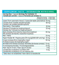 Lipasa (de tejido pancreático) (enzima), Lactasa (de candida pseudotropicalis) (enzima), Pancreatina (enzima), Celulasa (de trichoderma longibrachiatum) (enzima), Alfa amilasa (de bacillus stearothermophilus) (enzima), Papaína polvo (enzima), Proteasa fúngica (de aspergillus niger) (enzima), Bromelina (de ananas comosus) (enzima) Malta (vegetal), Fructooligosacáridos (vegetal), Piper nigrum (fruto) (vegetal), Lactobacillus acidophilus (1/2 billón CFU) (probiótico).